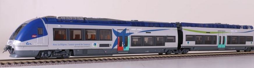 Modèle réduit de la marque LS MODELS, très finement détaillée de l'AGC X 76633, bleu/vert/gris métallisé, livrée Basse Normandie à trois caisses