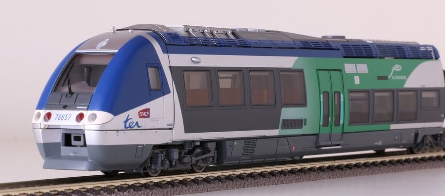 Modèle réduit finement reproduit de l'Autorail AGC X 76657, bleu/gris métallisé/vert, Auvergne, trois caisses