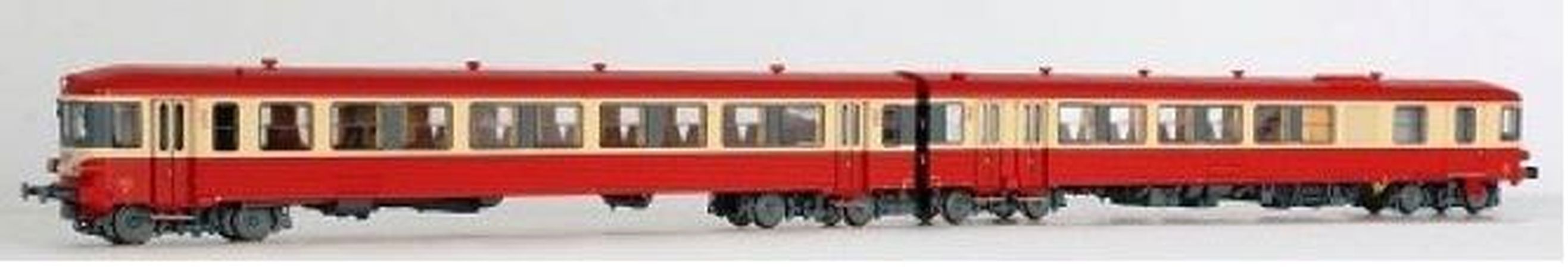 Modèle réduit LS Model finenent détaillé représentant un autorail diesel EAD X4300 + XR8300 SNCF dépôt de Tours de couleur rouge/crème, toit rouge, marquage jaune, avec éclairage intérieur