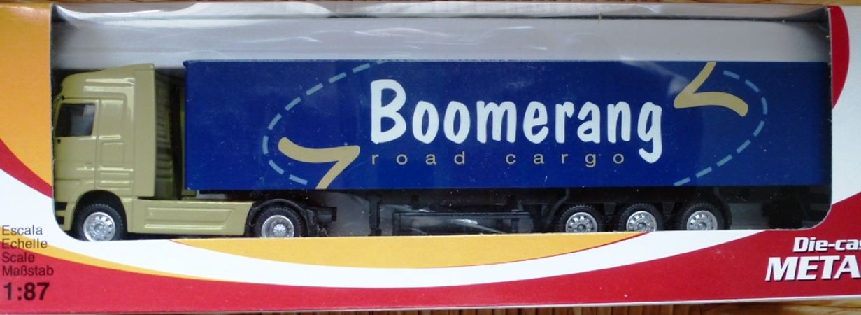 Modèle réduit Joal (Espagne)représentant un Camion semi remorque Mercedes : bâche bleue avec la mention Boomerang "road cargo" et cabine de camion beige