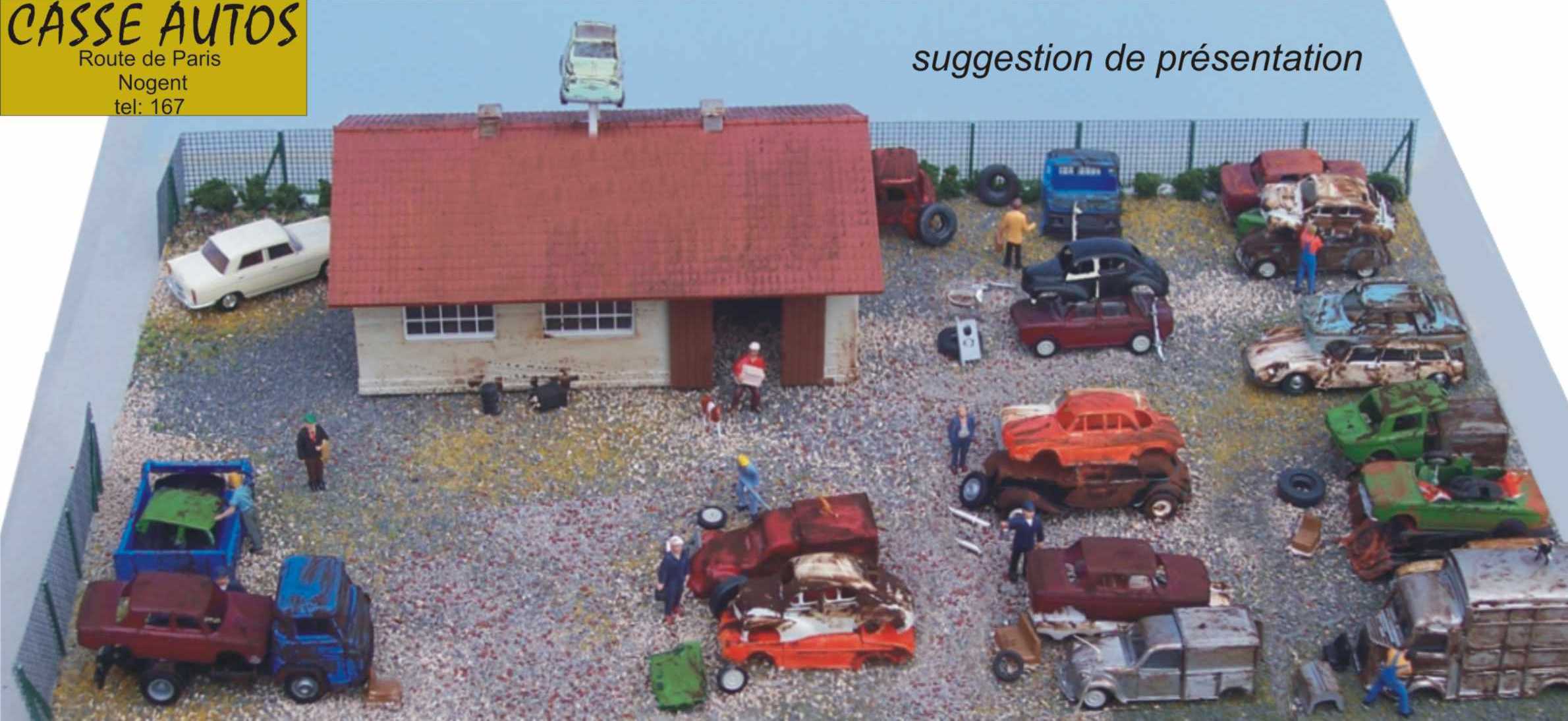 Maquette plastique, à monter soi-même, représentant une casse automobile des années 1960