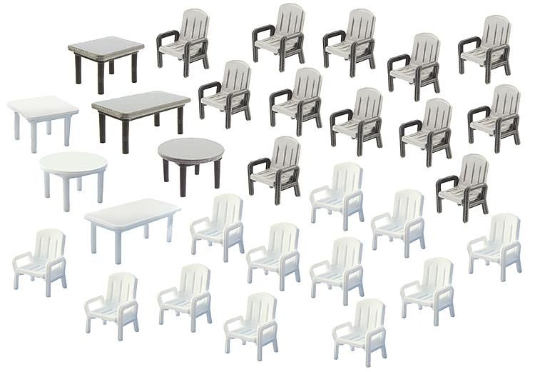 Figurines Faller se composant de plusieurs tables de différentes dimensions et de chaises de jardin
