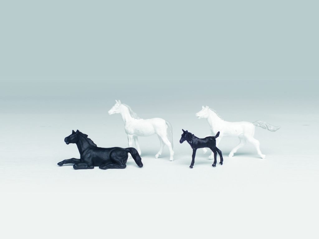 Groupe de 4 animaux, 3 chevaux et un poulain