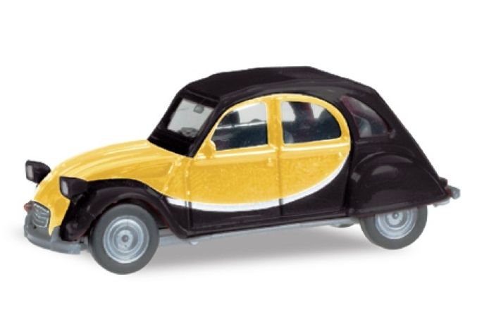 Véhicule miniature Herpa très finement détaillé représentant une Citroën 2CV Charleston de couleur jaune et noir