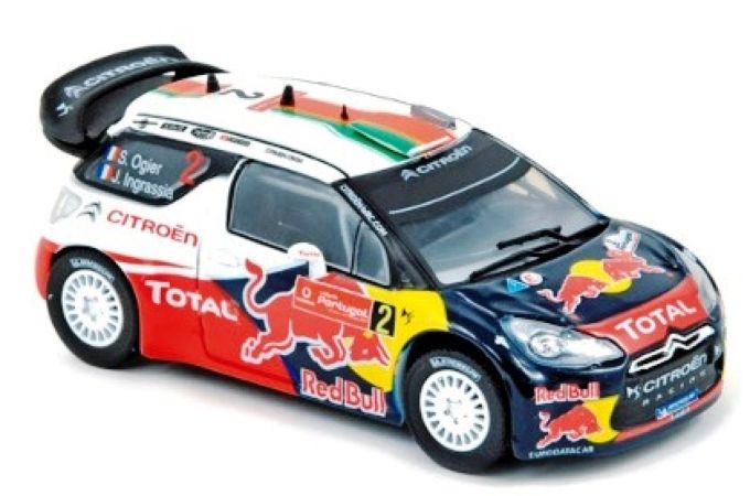 Véhicule Norev représentant une Citroën DS3 WRC Winner Rallye du Portugal 2011 piloté par S. Ogier et J. Ingrassia avec comme publicité Redbull