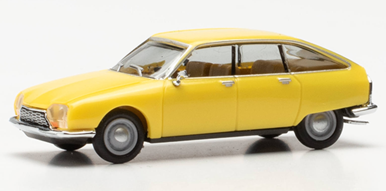 Miniature finement détaillée de la marque Herpa représentant une Citroen GS couleur jaune primrose.