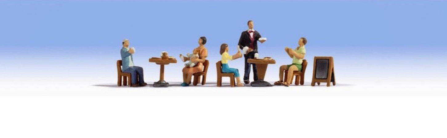 Figurines Noch finement détaillées représentant 4 client et un serveur avec tables et chaises dans un restaurant ou sur une terrasse.