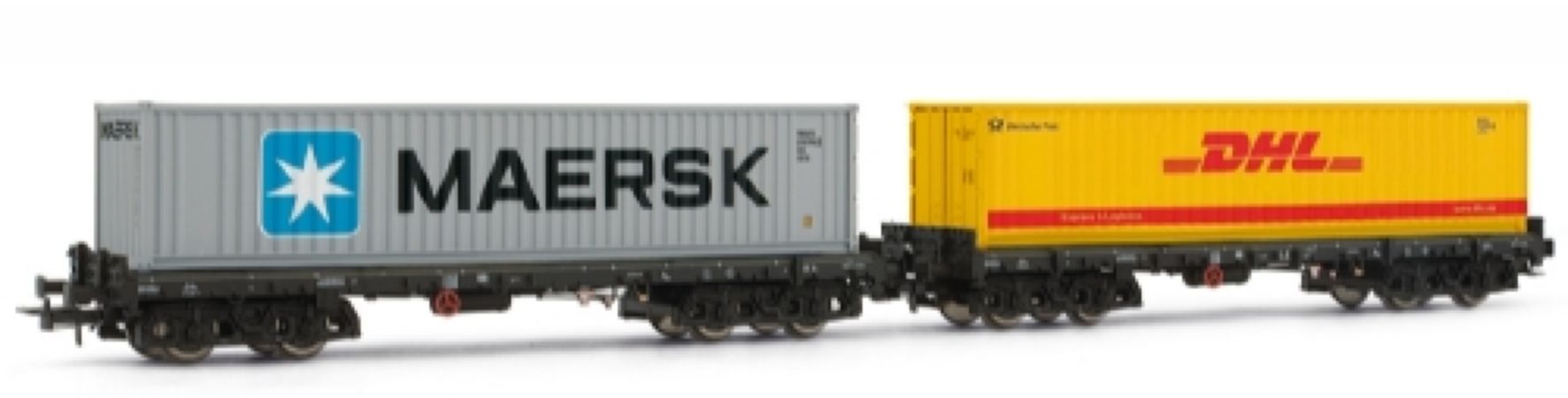 Modèles réduits RIVAROSSI représentant 2 wagons de la DB, type Sgmmns 738 (ex Rmms 663) avec containers 40' Maersk et DHL.