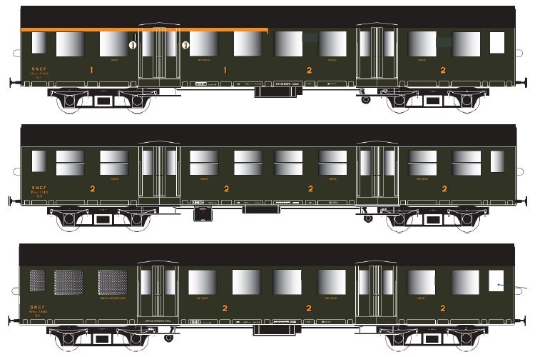 Coffret 3 voitures Romilly ABtmyp + Btmyp + BDtmyp, chassis noir, éclairage intérieur