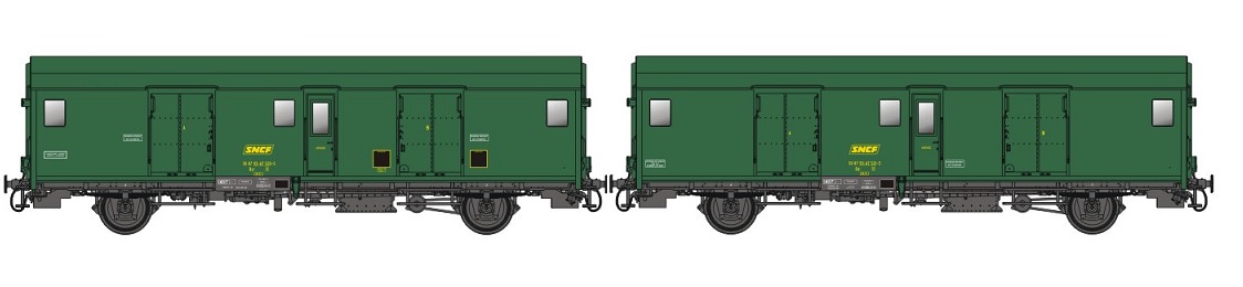 Représentation fidèle de 2 fourgons métallisés MIDI Dd2ai de la SNCF, vert 301 :