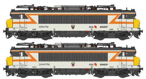 Coffret de 2 locomotives électrique BB 22404 / BB 22405 livrée grise et bande orange avec logo nouille SONORE