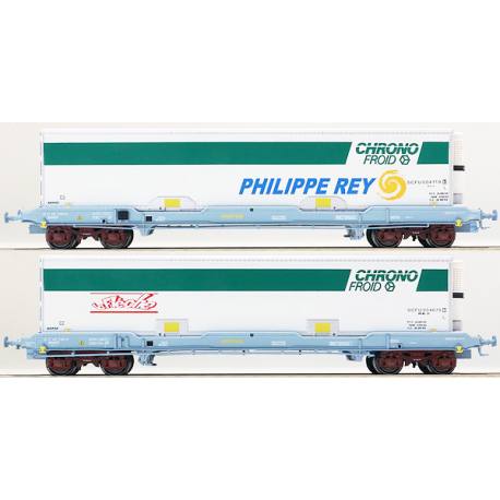 Coffret de 2 wagons plats avec caisse mobile frigorifique CHRONO FROID livrée La Flèche et Philippe Rey