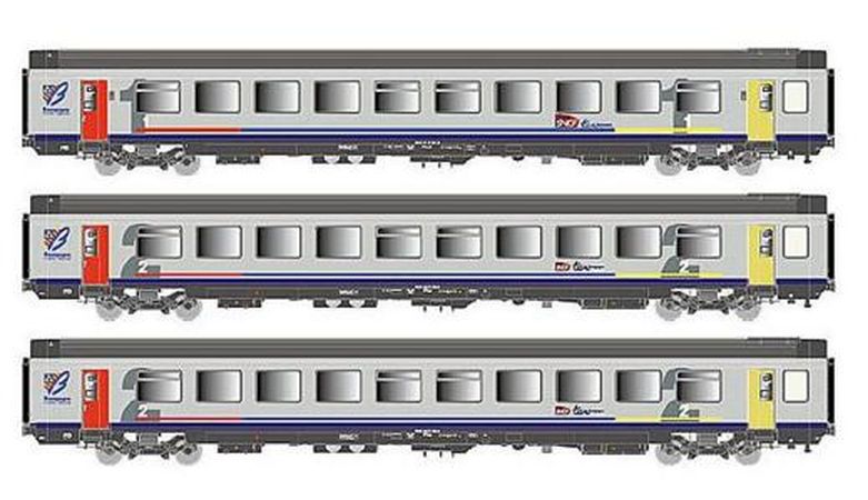 Coffret de 3 voitures corail "Bourgogne" livrée gris à bande bleue avec porte bout de ligne rouge et jaune