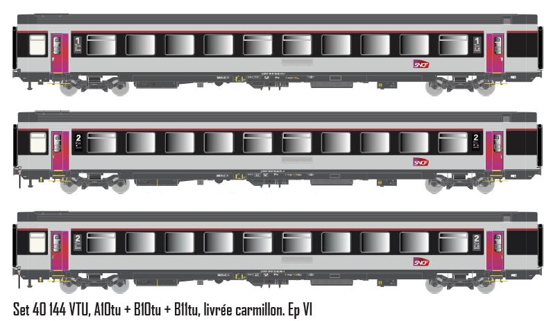 Coffret de 3 voitures Corail Vtu A10tu + B10tu + B10tu, SNCF livrée carmillon