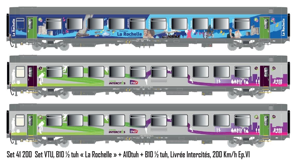 Coffret de 3 voitures Corail Vtu, SNCF livrée "La Rochelle" et "Intercités"