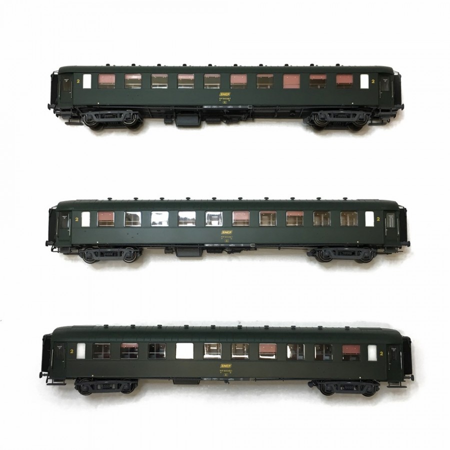 Coffret de 3 voitures OCEM seconde classe B10 livrée verte, châssis gris, toit vert, marquage UIC