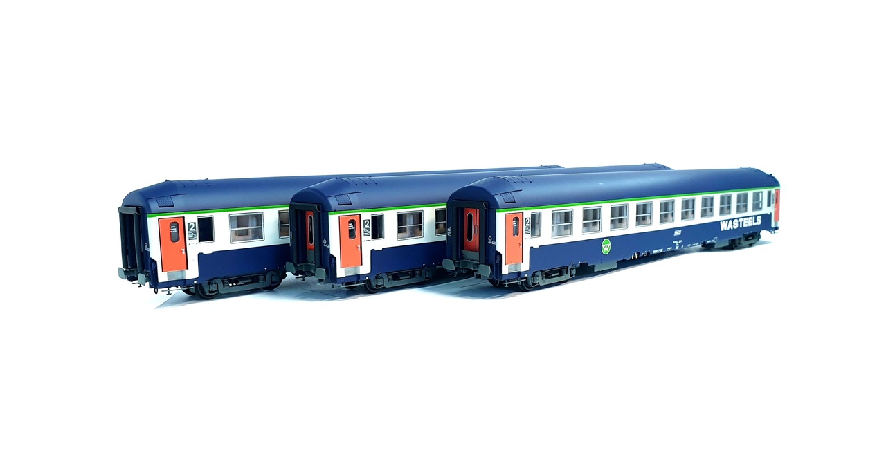 Coffret de 3 voitures UIC couchettes bleu / gris béton, toit haut, WASTEELS