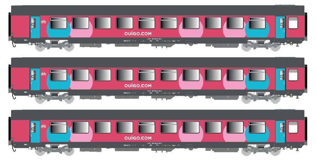 Coffret LS MODELS contenant 3 voitures voyageurs Vtu (B10rtu / B10rtu / B11tu) de la SNCF en livrée OUIGO avec toiture gris foncé