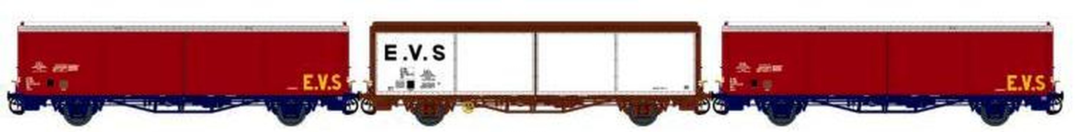 LSMODEL LSM30662 - Coffret de 3 wagons couvert EVS livrée rouge, brun/blanc avec parois planes et logo "E.V.S"
