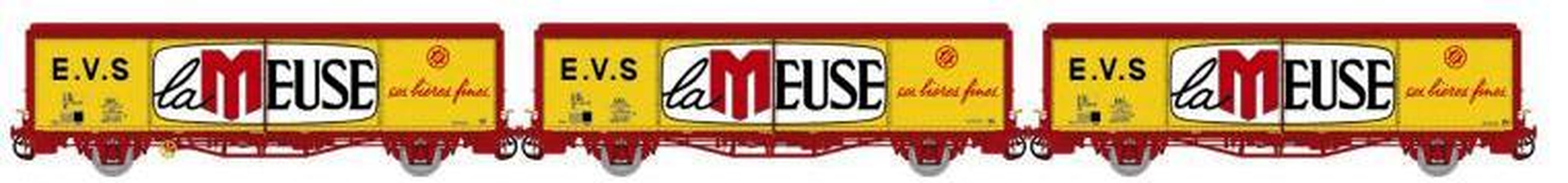 LSMODEL LSM30667 - Coffret de 3 wagons couvert EVS livrée rouge/jaune avec parois planes et logo "LA MEUSE"