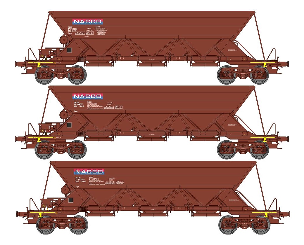 Contenu : 3 wagons trémies à bogies EX Type 1 pour le chargement de ballast en livrée NACCO.
