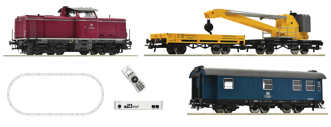 Ce coffret est composé d'une locomotive diesel série 211 avec train-grue de la Deutsche Bundesbahn, ainsi que d'un ovale de voies et tous les éléments pour commander le réseau en digital. La flèche de grue est mobile en hauteur et le plateau de la grue pivote à 360°