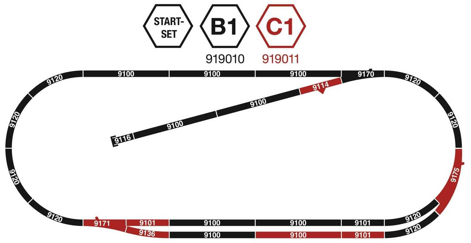 Proposé sous la référence Fleischmann 919011, ce coffret de voies C1 contient les voies repérées en rouge sur le schéma, à savoir: