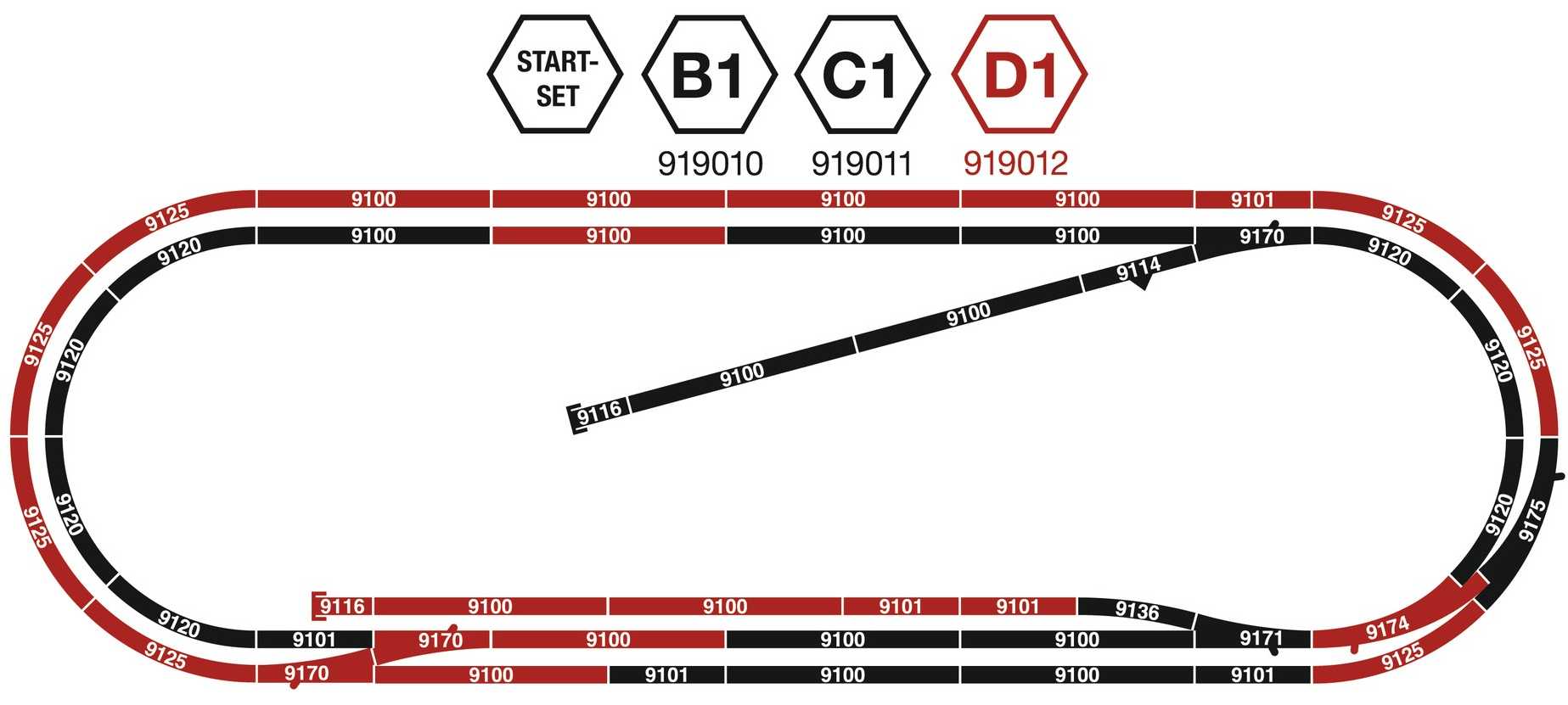 Proposé sous la référence Fleischmann 919012, ce coffret de voies D1 contient les voies repérées en rouge sur le schéma, à savoir: