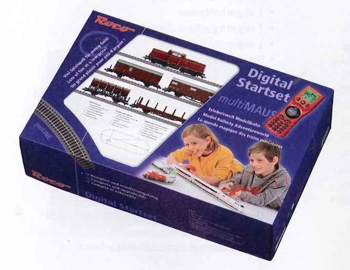 - Circuit Roco GeoLine, figures A+B (2,5 m par 0,9 m) comprenant : 21 éléments droits G200 (longueur 200 mm), 1 élément d'alimentation pré-installé, 12 éléments courbes R3 (rayon 434,5 mm), 1 aiguillage manuel gauche, 1 butoir, 1 fin de ballast).
