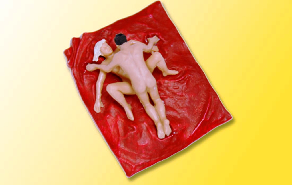 Modèle réduit Viessmann représentant un jeu érotique d'un couple amoureux sur une couverture.