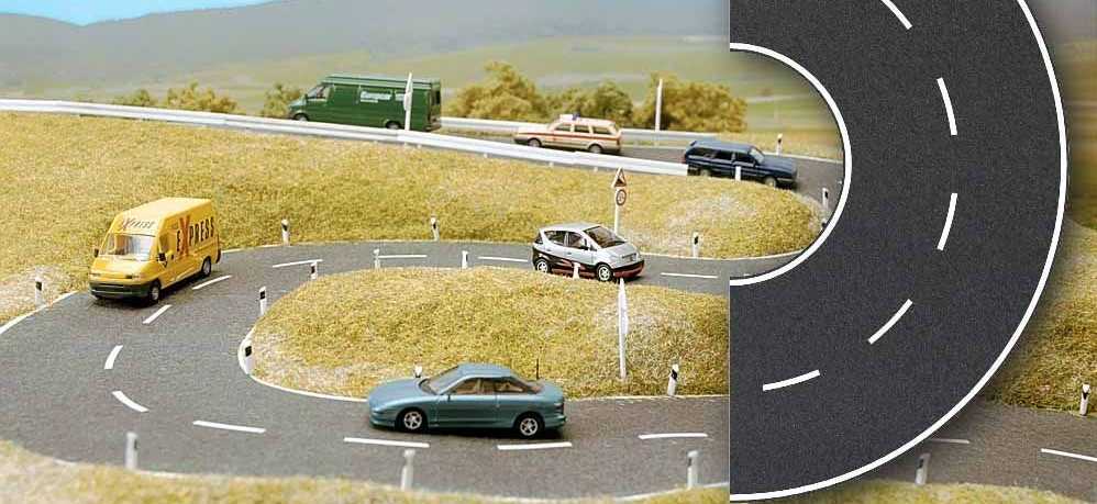 Demi-cercle, auto-adhésif. largeur de la route de 80 mm, diamètre 230 mm, même couleur de la structure du matériau que les routes asphaltées. Le demi-cercle peut être coupé avec des ciseaux, par exemple, dans les quadrants ou sections, chacune avec un angle quelconque.