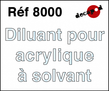 Ce diluant est prévu pour être ajouté aux peintures acryliques à solvant Decapod afin d'en compléter la dilution. Il est sans risque pour la peinture et n'en dégradera pas les qualités même en cas de très forte dilution (200, 400%...).