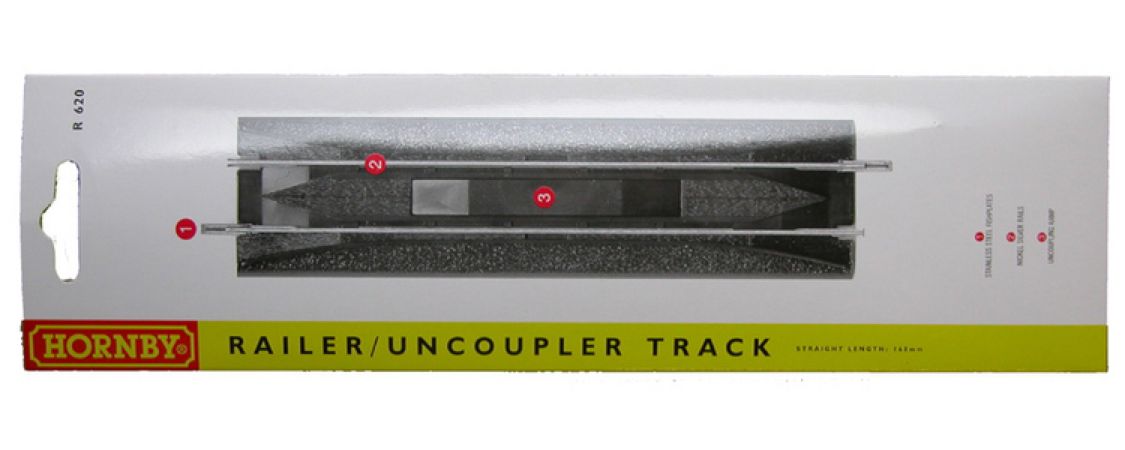 Cet élément de voie, de la marque Hornby, a une double fonction : elle joue le rôle de rail "auto-enrailleur" (facilite la mise sur rails des wagons et locomotives) et de rail dételeur (permet de dételer). Le principe est le suivant :