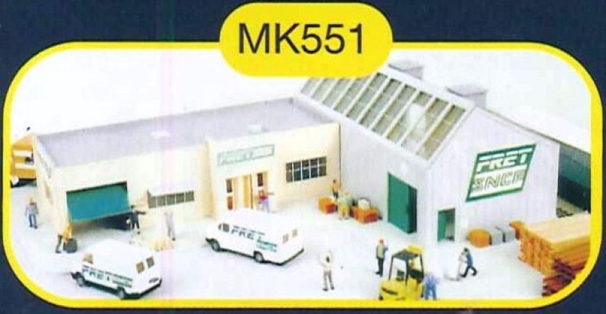Maquette à l'échelle HO de la marque MKD, représentant un entrepôt français