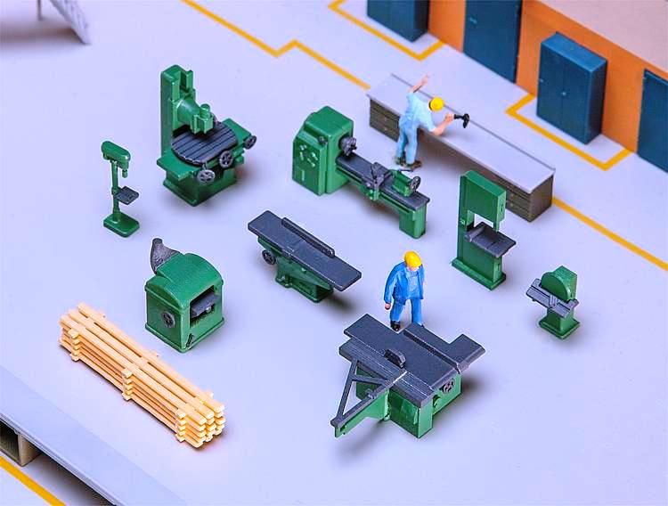 Petites machines constitué de diverses machines de menuiserie et de la métallurgie tels que scie à ruban, routeur de scie circulaire, ponceuse à disque, raboteuse, raboteuse et tour.