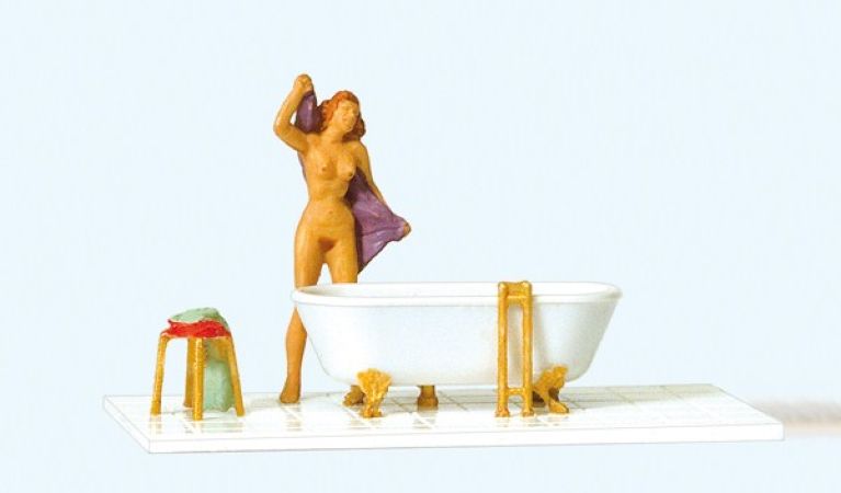 Figurine PREISER représentant une femme dans sa salle de bains et quelques accessoires.