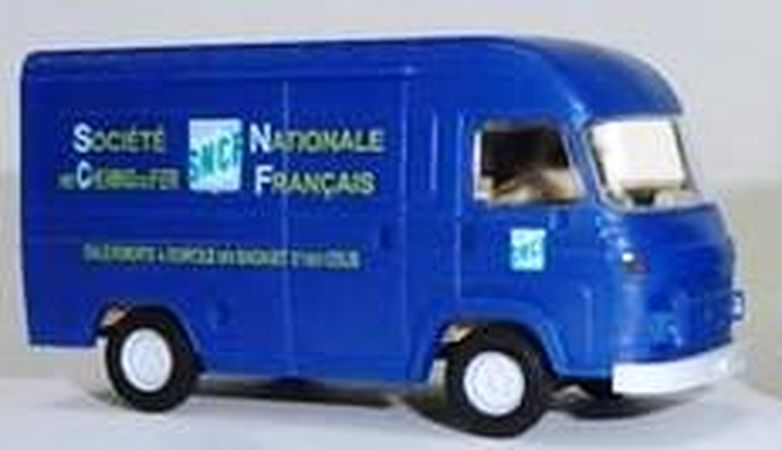 Modèle réduit représentant un fourgon de la marque Saviem SG2 de la SNCF, de couleur bleu.