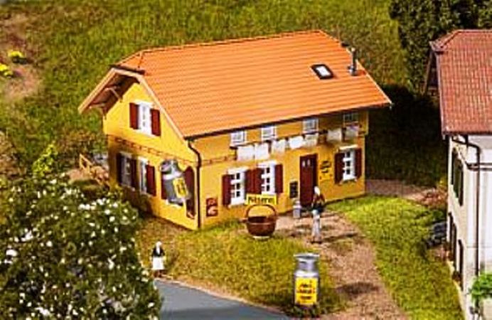 Maquette Faller représentant une laiterie traditionnelle de paysans producteurs avec une petite boutique de spécialités locales au rez de chaussée.