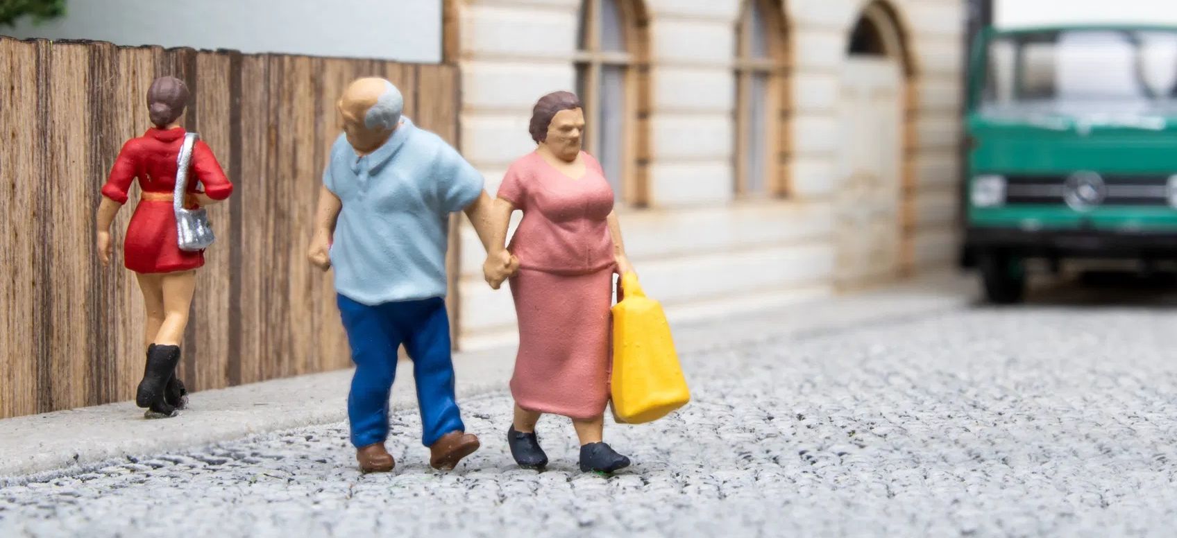 Cette référence NOCH 16603, comprenant 3 figurines d'adultes, est idéale pour représenter une scène amusante où l'on voit un homme marchant avec sa femme main dans la main, se retourner lorsqu'il croise une belle jeune fille.
