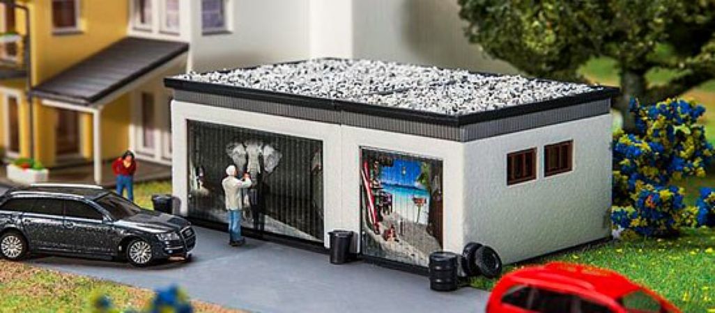 Modèle réduit Faller représentant un garage double fonctionnel.