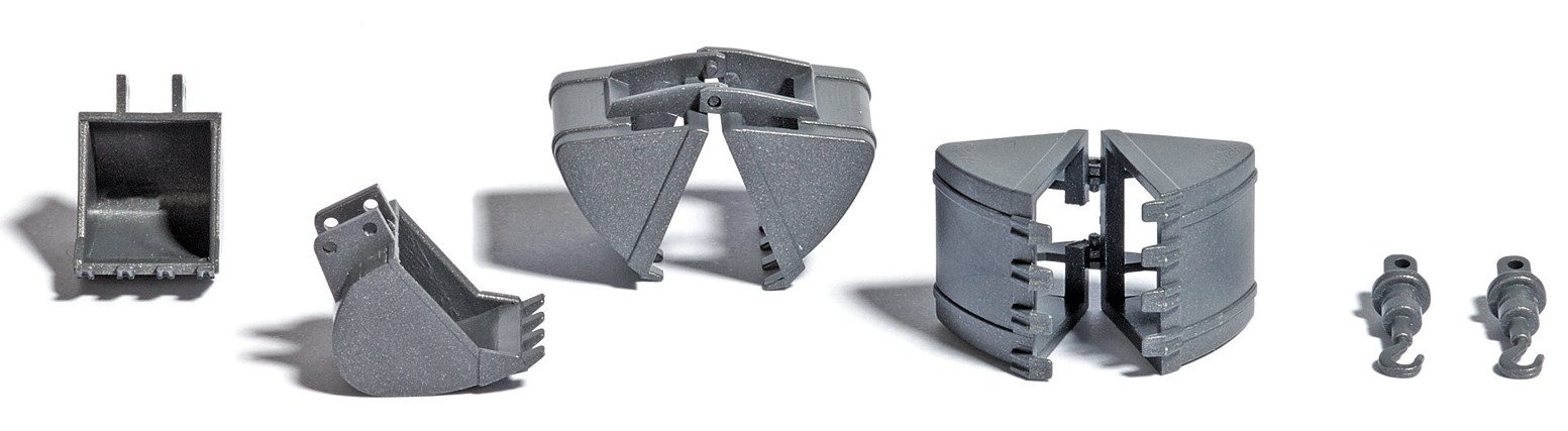 Mini set de décoration miniature pour modélisme ferroviaire ou diiorama, comprenant 2 pinces à godets, 2 godets de chargeuse frontale et 2 crochets d'arrimage.