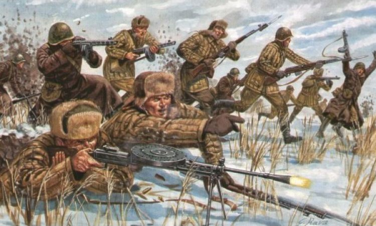 Maquette Italeri représentant des figurines de l'infanterie russe de la seconde guerre mondiale.