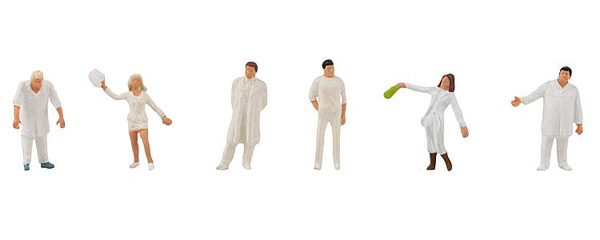 Figurines miniatures de la marque Faller à l'échelle HO (1/87e) représentant des Infirmiers et Infirmières (Assistants médicaux de laboratoire).