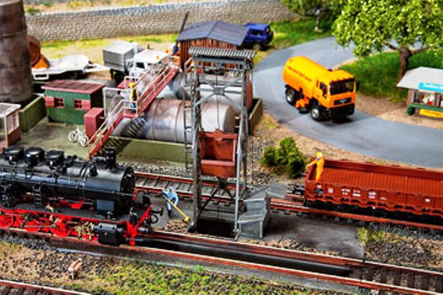 Maquette Faller représentant le démontage d'une locomotive à vapeur pour laquelle les résidus de combustion sont directement déversés dans un chariot de la fosse et la manivelle est ensuite tirée vers le haut avec un plan incliné, puis basculée et vidée dans un chariot.