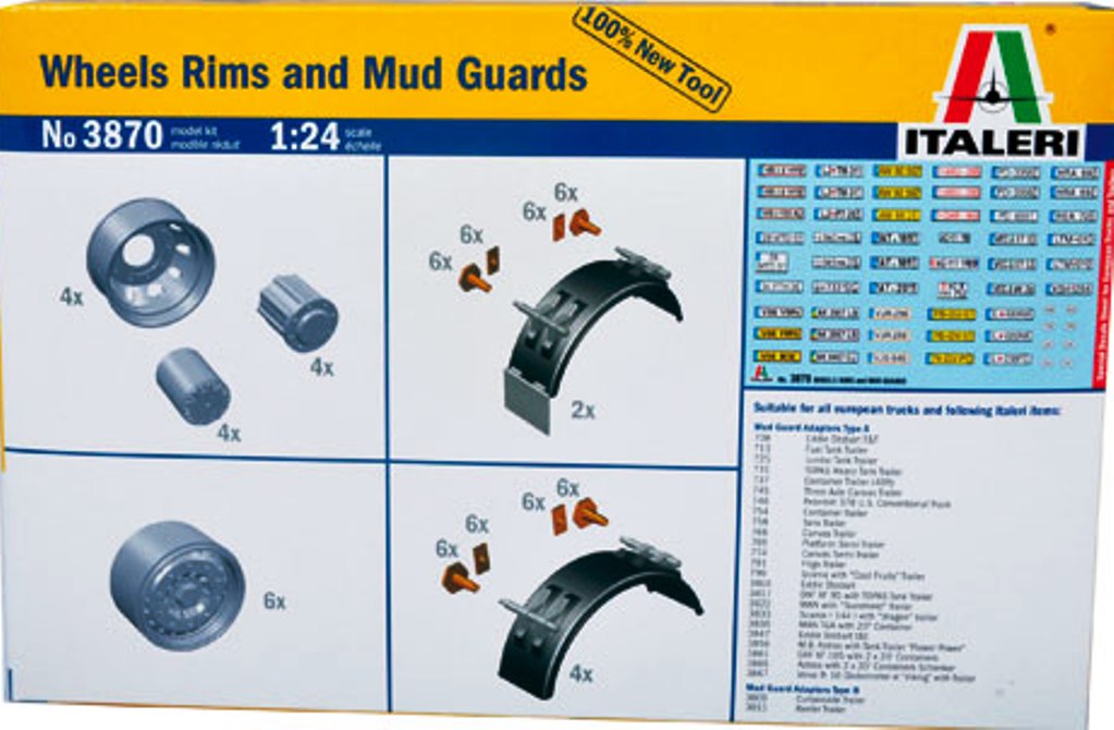 Cet ensemble a été conçu pour moderniser et changer le nombre de semi-lourd dans la ligne Italeri Echelle 1/24. Il comprend une série de six ailes modernes avec des adaptateurs pour les remorques ancien et le nouveau modèle, comme indiqué dans la liste publiée sur le paquet.