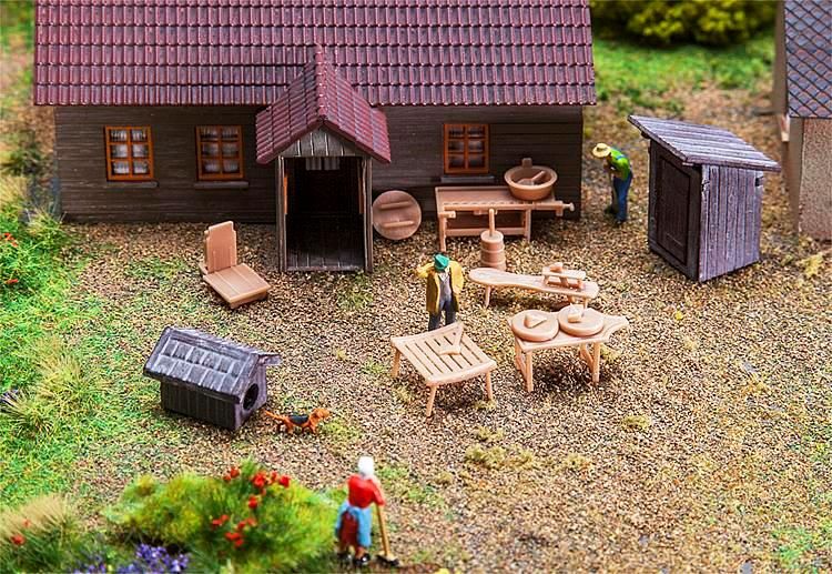 Petites pièces prévues pour la conception de la scène rurale avec une dépendance rustique, niche, l'établi, fromage de table et bien plus encore.