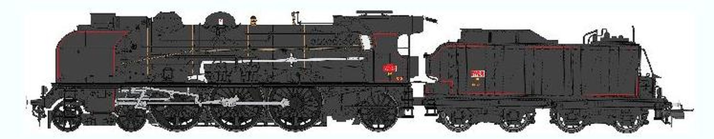 Machine 1-231 K 28 SNCF NANCY - cheminée double, grands écrans fumée, pompe Bi-Compound, ACFI, tender 30m³, machine et tender Noirs, filets rouges.