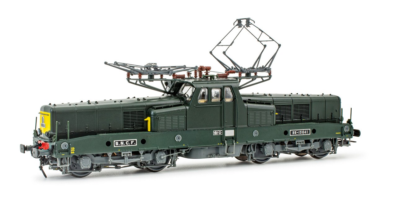 Modèle réduit Jouef de la locomotive électrique BB 13041 de la SNCF, verte et jaune, feux rouges, fanaux démontés, dépôt de Strasbourg, réseau Est, époque IV