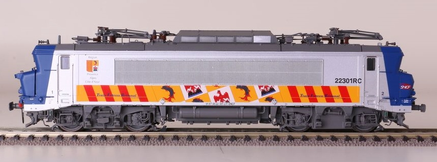 Modèle réduit représentant la locomotive BB 2231RC de la SNCF, couleur gris/bleu TER PACA, numéro frontal, grande cabine, 160 km/h, du dépôt de Marseille