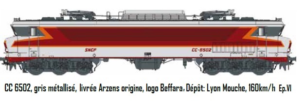 Locomotive électrique CC6502 SNCF, gris métalisé, livrée Arzens, logo Beffara, 160 km/h, Lyon mouche